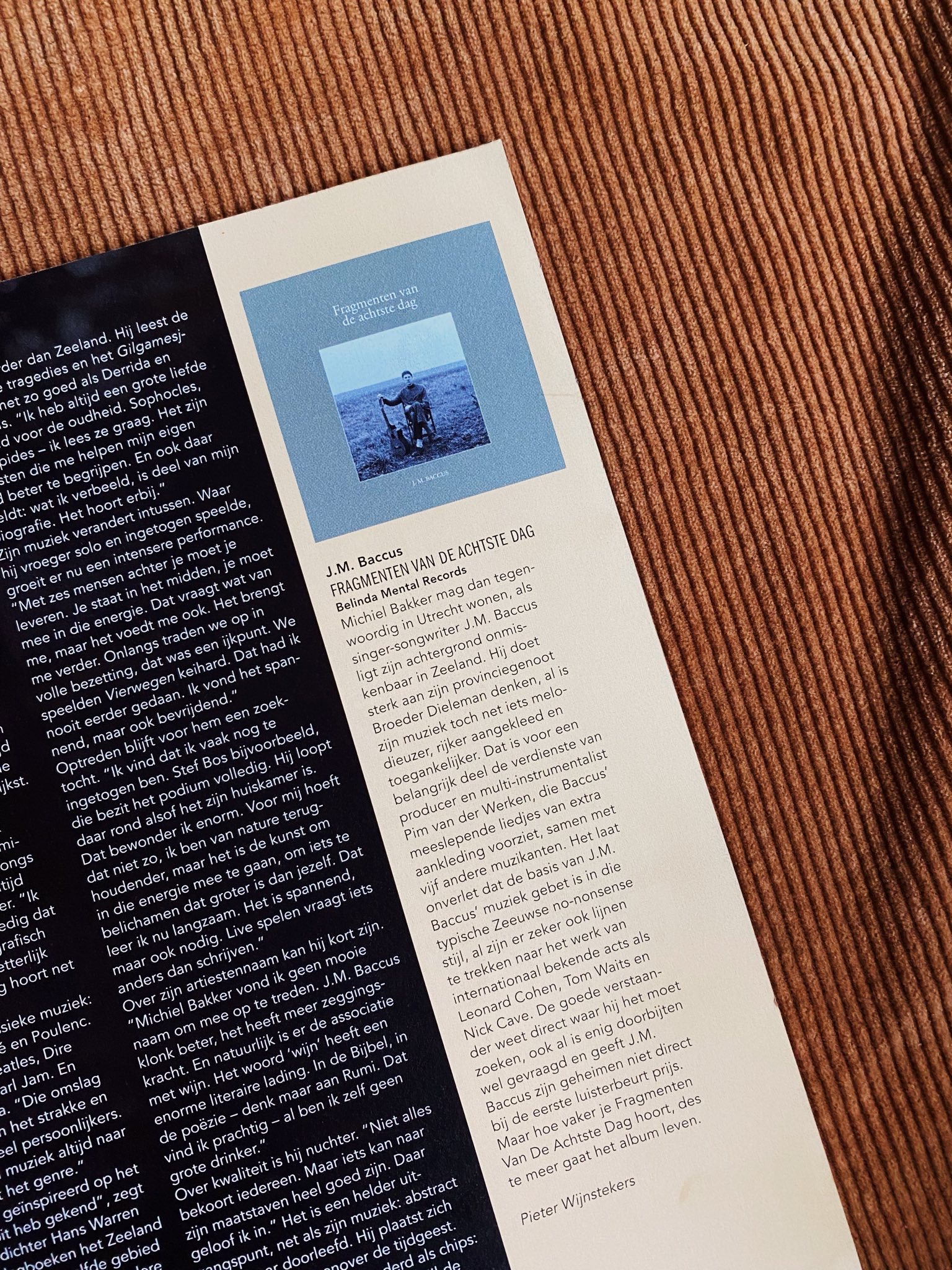 Fragmenten van de achtste dag is het eerste album van J.M. Baccus. De acht nummers bieden acht vensters op de ‘achtste dag’: het leven als mens in een wereld die fluistert en gromt. Dat geeft donkere folk-muziek voor zowel het tedere als het zwarte van het hart.